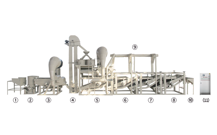 ① 上料斗② 原料提升机 ③ 多功能除杂机 ④ 斗式提升机 ⑤ 脱壳、风选、分选主机 ⑥ 籽仁复选机1 ⑦ 籽仁复选机2 ⑧ 籽仁复选机3 ⑨ 风力回料系统 ⑩ 接料斗 (11) 电气控制柜
