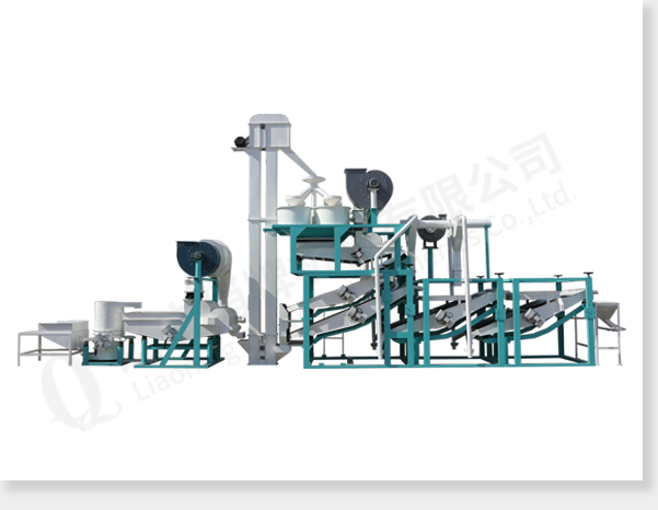 ① 上料斗② 斗式提升机 ③ 脱壳、风选、分选主机 ④ 籽仁复选机1 ⑤ 籽仁复选机2 ⑥ 风力回料系统 ⑦ 接料斗 ⑧ 电气控制柜