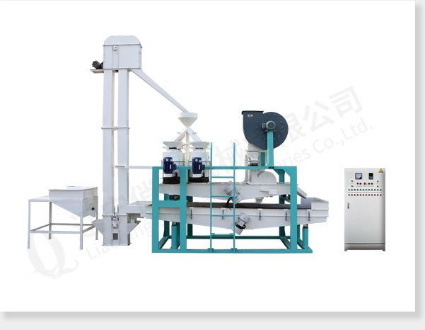 ① 上料斗② 斗式提升机 ③ 脱壳、风选、分选主机 ④ 吸风回料 ⑤ 籽仁复选机 ⑥ 风选除皮筛 ⑦ 接料斗 ⑧ 电气控制柜